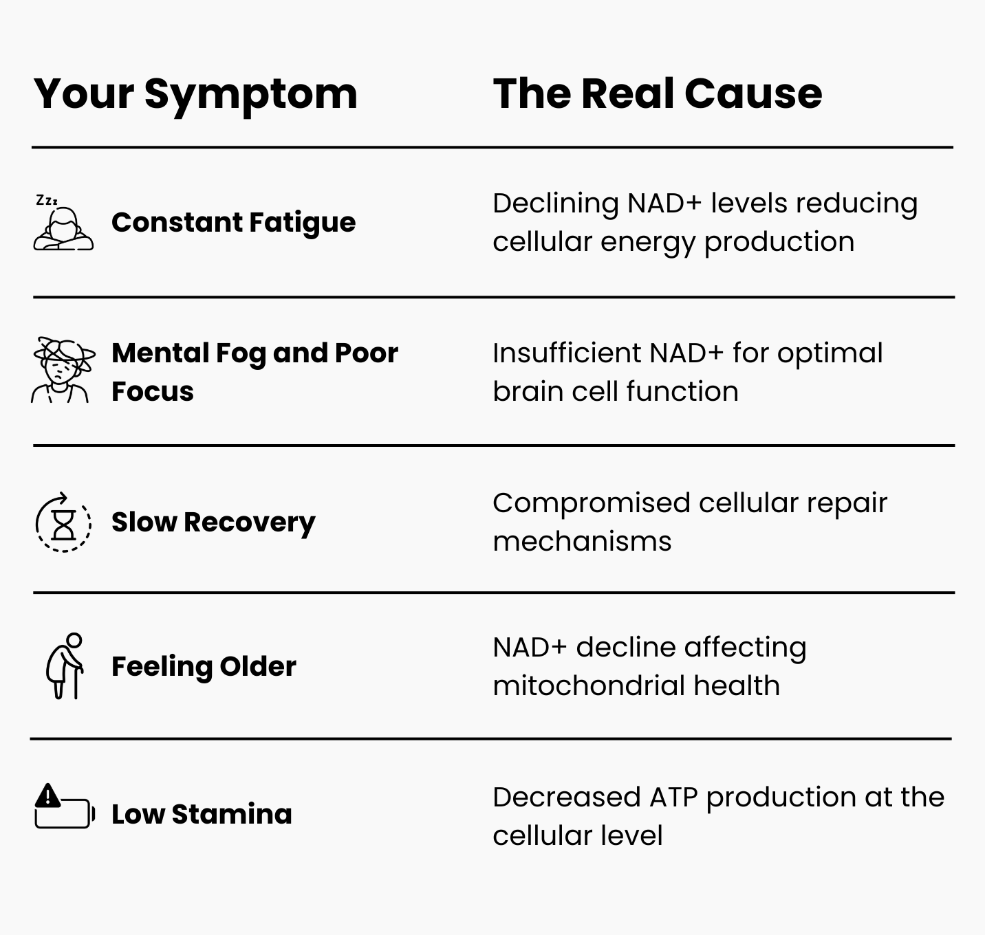 A: Those foundations are essential — but many people still notice declining energy, slower recovery, and brain fog despite doing the basics well. NAD+ naturally decreases with age and stress, so supporting cellular energy production can complement healthy lifestyle habits rather than replace them.