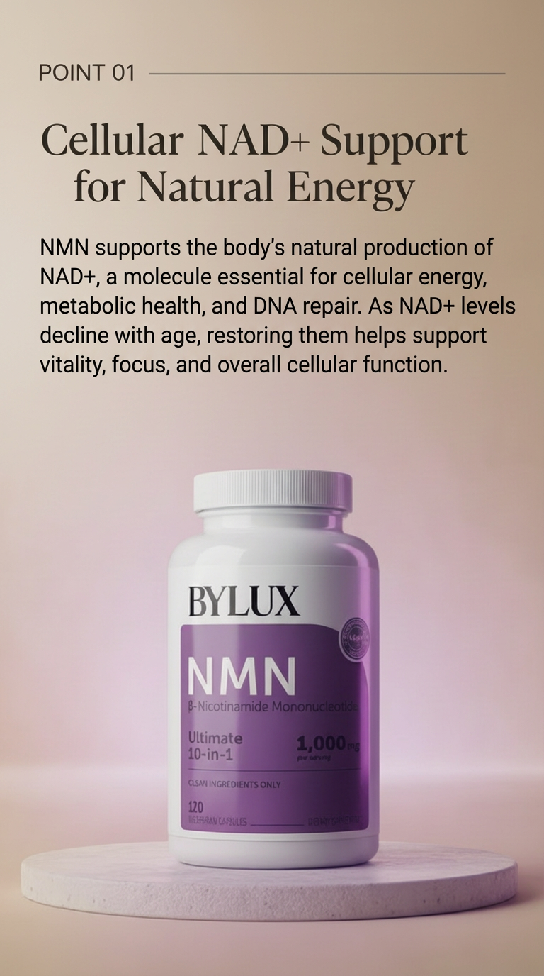 • Formulated with high-purity NMN, a direct NAD+ precursor studied for its role in cellular energy production and repair