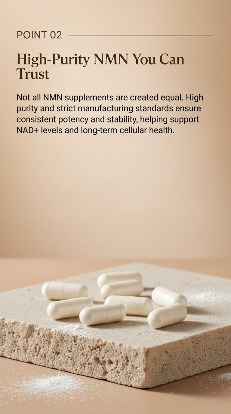 A: Quality matters significantly in this category. This formula is produced with high-purity NMN and undergoes third-party testing to help verify identity, purity, and potency, so you can feel confident you’re getting a reliable and accurately dosed product.